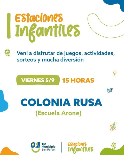 ATENCIÓN CHICOS: VUELVEN LAS ESTACIONES INFANTILES!!! homepage Inf. General 2 septiembre, 2025 Este fin de semana, tras la suspensión por las lluvias del sábado y domingo. Con entrada libre, de 15 a 18 horas. Viernes: Colonia Rusa Sábado: Los Leones, La Guevarina, Villa 25 de Mayo (Polideportivo) y Bº Valle Grande (Club El Porvenir). Domingo: Cuadro Benegas (Club), Bº Constitución (Trop. Sosa y Paula Albarracín), Villa Laredo (Fleming y Palau) y Real del Padre (Polideportivo). Comentarios comentarios