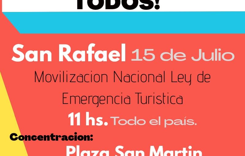 Mañana se manifestarán prestadores turísticos en plaza San Martín Economía homepage 14 julio, 2020 Será mañana a las 11 AM en todo el país, y en San Rafael la concentración será en Plaza San Martín. Se autoconvocarán trabajadores del transporte, agencias, hoteles, restaurantes y guías, pese a la cuarentena. La manifestación coincide con voces de funcionarios provinciales, que dijeron que tanto Valle de Uco como Malargue han reactivado su economía con el turismo interno, con una importante ocupación de alojamiento, en especial los fines de semana.