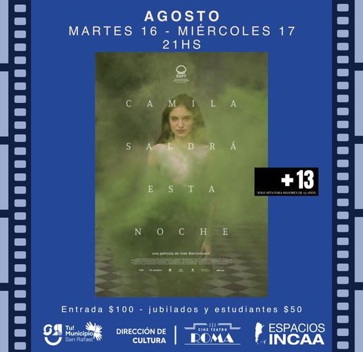 CINE EN EL ESPACIO INCAA DEL ROMA homepage Inf. General 16 agosto, 2022 Hoy y mañana, desde las 21 hs, se proyectará el drama “Camila saldrá esta noche”, con las actuaciones de Nina Dziembrowski, Maite Valero, Adriana Ferrer, Carolina Rojas, Federico Sack, Guillermo Pfening. Entrada general $100, estudiantes y jubilados $50.