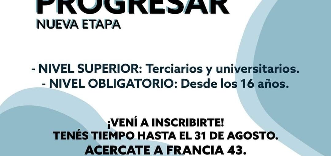 BECAS PROGRESAR: EL MUNICIPIO AYUDA A LOS INTERESADOS homepage Inf. General 11 agosto, 2022 En la Coordinación de Juventud (Francia 43) continúa la inscripción para las becas Progresar. La atención es de 8:30 a 18 hs, y está disponible hasta el 31 de agosto. En la mencionada oficina municipal están disponibles los requisitos y el paso a paso para anotarse. Se trata de un programa integral de Becas Educativas, que acompaña al alumno en todos los niveles de formación, a través de un incentivo económico.