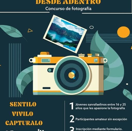 SUMATE AL CONCURSO FOTOGRÁFICO DE JUVENTUD homepage Inf. General 14 enero, 2026 Te invitamos a participar del Concurso Fotográfico: San Rafael Desde Adentro que organiza la Coordinación de Juventud. Una propuesta para jóvenes de entre 16 y 25 años para mostrar paisajes, rincones, personas y detalles que reflejen la identidad sanrafaelina. Tenés tiempo hasta el 16 de enero para inscribirte Encontrá el link de inscripción en @coordinaciondejuventud