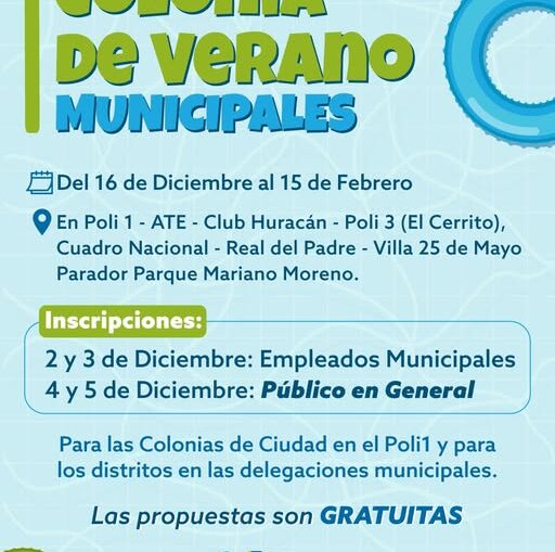 INSCRIPCIONES A LAS COLONIAS DE VERANO homepage Inf. General 1 diciembre, 2025 Este martes 2 y miércoles 3 abren las inscripciones para las colonias de verano para empleados municipales. El jueves 4 y viernes 5 podrá hacerlo el público en general. Para las colonias de Ciudad (Poli 1, ATE, Huracán y Parador del Parque Moreno) se anota por la mañana en el Poli 1, para las de distritos (Poli 3, Cuadro Nacional, Real del Padre y Villa 25 de Mayo) en las delegaciones municipales.