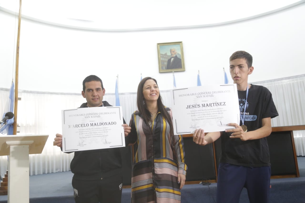 Reconocimientos en el Concejo Deliberante Inf. General inicio 5 noviembre, 20195 noviembre, 2019 Fueron distinguidos esta mañana por el Concejo Deliberante los jóvenes Jesús Martínez y Marcelo Maldonado, de la Fundación Tremo Kawell, que representando a Mendoza obtuvieron medallas de oro en las disciplinas raqueta de nieve y deslizamiento en esquí. También se le hizo entrega a la familia de Don Eugenio Ballarini, la Ordenanza por medio de la cual se le colocó el nombre de Don Eugenio a una calle del departamento.