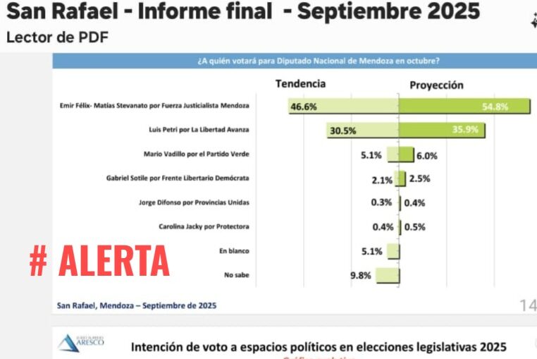 LLEGAN LAS PRIMERAS ENCUESTAS: EN SAN RAFAEL EMIR FÉLIX LE LLEVA MÁS DE 15 PUNTOS A LUIS PETRI homepage Politica 3 octubre, 2025 A 24 días de las elecciones para elegir Diputados Nacionales, la ventaja del Frente compuesto por La Libertad Avanza y Cambia Mendoza es muy significativa en la provincia, sin embargo en nuestro departamento el ex intendente lleva la delantera. Así lo anticipa la consultora Aresco (IMAGEN), que realizó un sondeo en todos los departamentos. En San Rafael la lista que encabeza Emir Félix ganaría por más de 15 puntos. Estos datos generaron que se prendiera la alarma en el oficialismo provincial, que intentará emparejar la intención de voto con la visita de Javier Milei el día del Almuerzo de las Fuerzas Vivas. En días más, #ALERTA realizará una encuesta similar en todos sus grupos de suscriptores. ASÍ SE DEBE VOTAR EL 26 DE OCTUBRE EN
