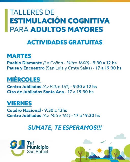 ESTIMULACIÓN COGNITIVA PARA ADULTOS MAYORES homepage Inf. General 12 marzo, 2026 Comienzan los talleres municipales de estimulación cognitiva para Adultos Mayores. Los martes de 9.30 a 12 en La Colina (Mitre 1600) y de 17 a 19.30 en Pausa y Encuentro (San Luis y Cmte Salas). Los miércoles de 9.30 a 12 en el Centro de Jubilados de Mitre 161 y de 17 a 19.30 en el Ctro de Jubilados Santa Ana. Los viernes de 9.30 a 12 en Cuadro Nacional y de 17 a 19.30 en el Centro de Jubilados de Mitre 161. Comentarios comentarios