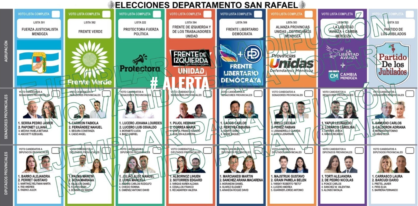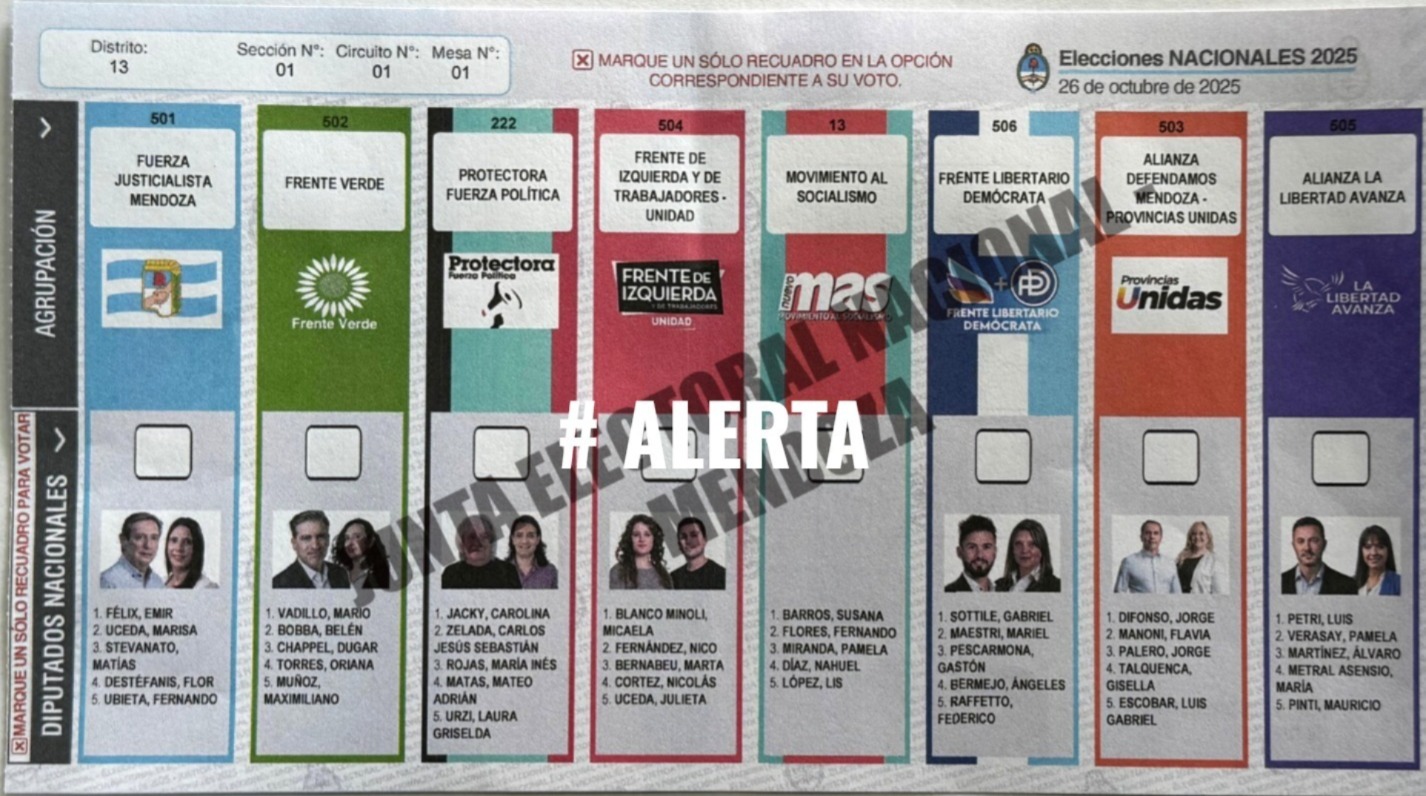 GUÍA PARA VOTAR EL DOMINGO 26 Carrousel Inf. General 17 octubre, 2025 Ante la confusión general, #ALERTA te explica de que se trata la próxima elección legislativa, y que tener en cuenta a la hora de votar: 1- Al llegar a la mesa de votación, el presidente te entregará dos boletas únicas de papel: Una para elegir autoridades nacionales (5 Diputados), y otra para escoger legisladores provinciales (4 Senadores y 5 Diputados). NO SE VOTA CONCEJALES (se elegirán el 22 de febrero). 2- Con ambas boletas en mano y una lapicera, vas a pasar a una cabina donde debés marcar con una cruz a que frente/partido preferís. Boleta Nacional (foto 1): Tenés que elegir una de las 8 opciones; o no marcar ninguna, para que tu voto sea considerado en blanco. Boleta Provincial (foto 2): Podés marcar una sola opción entre las 8 existentes, en el casillero que se encuentra en la parte superior; de esa manera elegís Senadores y Diputados de un mismo frente/partido. Pero también está la opción de votar Senadores de un frente/partido y Diputados de otro, por lo que tenés que hacer dos cruces distintas… Y tal como en la nacional, no hacer marcas es votar en blanco. LECTURA POLÍTICA: BOLETA NACIONAL 1- ¿Apoyás a Javier Milei?: En ese caso tendrías que marcar el casillero de “La Libertad Avanza”, lista encabezada por Luis Petri, ya que esos candidatos son los que representarán al Presidente en el Congreso de la Nación. 2- ¿Apoyás a Milei, pero sobre eso preferís a un ex intendente sanrafaelino en el Congreso que pueda traer beneficios el departamento?: Allí la opción es votar a Emir Félix, que encabeza la lista de Frente Justicialista Mendoza. 3- ¿No te gusta este Gobierno Nacional?: Tenés otras siete alternativas, entre ellas el Frente Libertario Demócrata (con ideas afines al Gobierno), y el propio Emir Félix. LECTURA POLÍTICA: BOLETA PROVINCIAL 1- ¿Apoyás el Gobierno de Alfredo Cornejo?: En ese caso tendrías que marcar el casillero de “La Libertad Avanza + Cambia Mendoza”. Allí están los hombres y mujeres que votarán los proyectos del Gobernador en la legislatura. 2- ¿No te gusta el Gobierno de Alfredo Cornejo?: Tenés otras siete alternativas, entre partidos de izquierda, centro y centro derecha, incluyendo el Frente Justicialista Mendoza, con la “gente” de los hermanos Félix. CONCLUSIÓN A grandes rasgos, como toda elección de medio término, tu voto sirve para darle apoyo a la gestión gobernante o “castigarla”, eligiendo otra alternativa. También de privilegiar lo local por sobre el resto. Comentarios comentarios