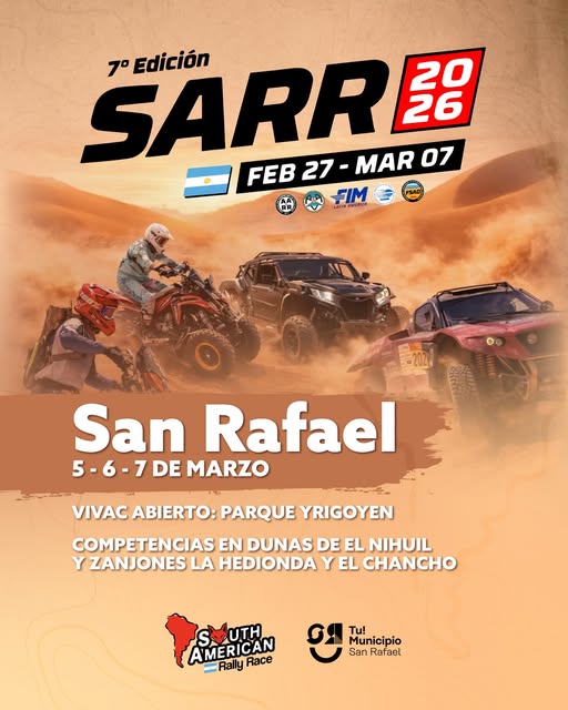 SE VIENE EL RALLY RACE: DEL 5 AL 7 DE MARZO EN SAN RAFAEL homepage Inf. General 27 febrero, 2026 Del 5 al 7 de marzo, San Rafael formará parte del @southamericanrallyrace. El vivac estará en el Parque Yrigoyen y habrá actividad en las dunas de El Nihuil y los zanjones El Chancho y La Hedionda. Comentarios comentarios