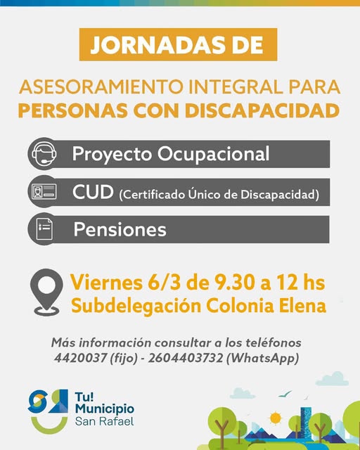 El área de discapacidad municipal atenderá el viernes de 9.30 a 12 en la delegación de Colonia Elena.