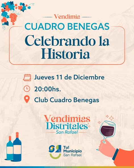 CANDIDATAS A REPRESENTANTE VENDIMIAL DE CUADRO BENEGAS homepage Inf. General 10 diciembre, 2025 Este jueves a las 20 Cuadro Benegas tendrá su fiesta vendimial “Celebrando la Historia” en el club del distrito y con tres candidatas. 1- María Luna Jofré (Unión Vecinal Bº Callejón Las Rosas) 2- Rocío Micaela Aguilera (Unión Vecinal Bº Echevarrieta) 3- Sofia Abigail Gorri (Club Social y Deportivo Cuadro Benegas) Comentarios comentarios