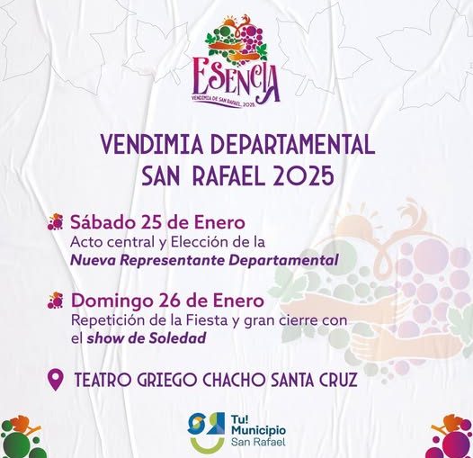 LA VENDIMIA 2025 YA TIENE NOMBRE: «ESENCIA» Carrousel Inf. General 17 diciembre, 2024 Día: Sábado 25 de enero. Responsables: El equipo de “Vendimiadores” está encabezado por Jonathan Gómez en la Dirección General y Marcelo Guajardo en la Dirección Artística, mientras que la autora del libreto es Lilian Cladera. Repetición: Domingo 26 de enero, con la presentación de Soledad Pastorutti. Entradas: Se pondrán a la venta en los próximos días.