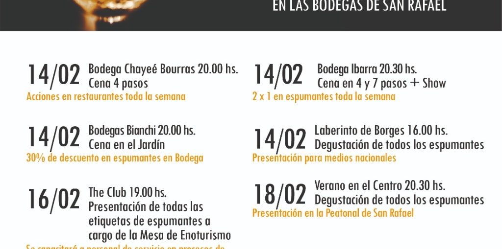 ARRANCO LA «SEMANA DEL ESPUMANTE»… PERO CON GUSTO A POCO Carrousel Inf. General 16 febrero, 2022 Como todos los años, las bodegas de la Mesa de Enoturismo, perteneciente a la Específica de Turismo de la Cámara de Comercio, han organizado diversas actividades para celebrar los Espumantes que se generan en el Departamento. Del 14 al 21 de febrero se podrá disfrutar de música en vivo, charlas, gastronomía, promociones y descuentos en las bodegas y restaurantes locales. Sin embargo, HAY MUCHAS COSAS QUE NO ESPECIFICA LA ORGANIZACIÓN (en especial costos), ni propone un evento único donde se pueda acceder a los distintos espumantes que se producen en nuestro departamento. Otro año en que SE DESPERDICIA ESTA MARAVILLOSA IDEA de la Cámara de Comercio. Cabe destacar que San Rafael es el principal elaborador de esta bebida en el país.