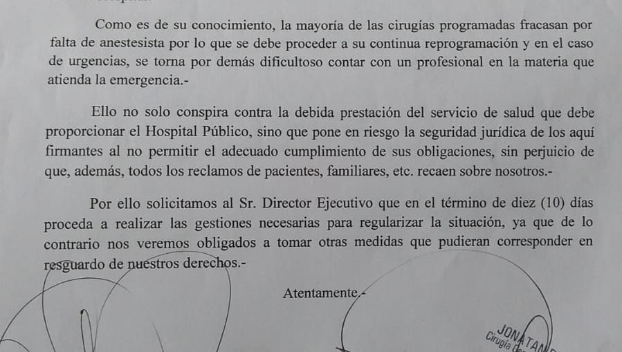 ¡GRAVISIMO!: CIRUJANOS DEL SCHESTAKOW DENUNCIARON A LOS ANESTESISTAS POR FALTAR A LAS OPERACIONES Carrousel Inf. General 2 noviembre, 2021 Veinte profesionales médicos, pertenecientes al área de Cirugía, enviaron una nota al director del nosocomio, con el fin de pedirle colaboración para regularizar la situación con los anestesistas, ya que no cumplen con la asistencia a las cirugías programadas, generando la reprogramación de las mismas. También denuncian que se torna dificultoso contar con ellos en las urgencias. “Ello no solo conspira contra la debida prestación del servicio de salud que debe proporcionar el Hospital Público, sino que pone en riesgo nuestra seguridad jurídica, al no permitir el adecuado cumplimiento de nuestras obligaciones, sin perjuicio de que, además, todos los reclamos de pacientes y familiares recaen sobre nosotros”, señalan en el comunicado. Por último, los cirujanos advirtieron que si en el término de 10