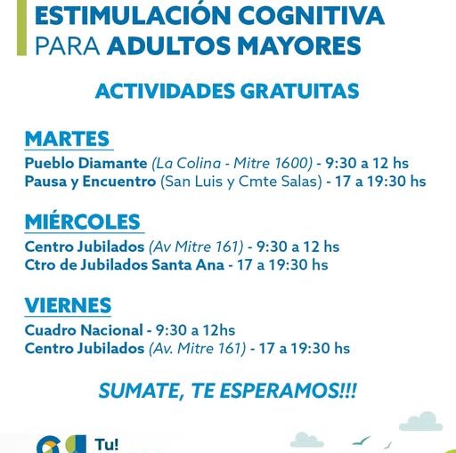 ESTIMULACIÓN COGNITIVA PARA ADULTOS MAYORES homepage Inf. General 12 marzo, 2026 Comienzan los talleres municipales de estimulación cognitiva para Adultos Mayores. Los martes de 9.30 a 12 en La Colina (Mitre 1600) y de 17 a 19.30 en Pausa y Encuentro (San Luis y Cmte Salas). Los miércoles de 9.30 a 12 en el Centro de Jubilados de Mitre 161 y de 17 a 19.30 en el Ctro de Jubilados Santa Ana. Los viernes de 9.30 a 12 en Cuadro Nacional y de 17 a 19.30 en el Centro de Jubilados de Mitre 161.