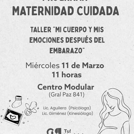 MATERNIDAD CUIDADA: CENTRO MODULAR homepage Inf. General 10 marzo, 2026 El programa Maternidad Cuidada de la Dirección de Salud estará el miércoles 11 en el Centro Modular (Gral Paz 841) con la propuesta “mi cuerpo y mis emociones después del embarazo”
