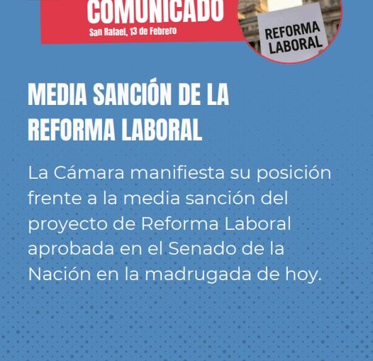 LA CÁMARA DE COMERCIO DE SAN RAFAEL AVALA LA REFORMA LABORAL homepage Inf. General 14 febrero, 2026 En un comunicado, la institución dio a conocer su posición respecto al proyecto de ley que esta semana tuvo media sanción en Senadores. “Desde hace más de cinco años la entidad viene reclamando una reforma laboral profunda para modernizar el sistema, reducir la litigiosidad, promover empleo formal y devolver competitividad a las empresas, especialmente a las PYMES del interior productivo”, arranca la nota. “La media sanción representa un avance significativo y un primer paso concreto hacia la normalización del esquema laboral argentino, afectado por rigideces, sobrecostos y distorsiones que perjudican la inversión y el desarrollo”, continúa el comunicado. Lo que más valora la Cámara es la flexibilización de modalidades de contratación; modificación del cálculo indemnizatorio (actualización por IPC + adicional anual); instrumentación de