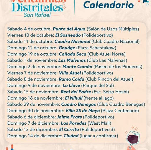 LLEGA OCTUBRE Y ARRANCA EL CALENDARIO VENDIMIAL DE SAN RAFAEL homepage Inf. General 30 septiembre, 2025 Comienza el mes de octubre y –con el- San Rafael empieza a palpitar su Vendimia 2026 El calendario distrital se desarrollará desde este sábado 4 de octubre y continuará el sábado 14 de diciembre, con 18 fiestas que incluyen shows artísticos y la proclamación o elección de sus representantes. Punta del Agua será el distrito que abra el calendario con su fiesta “Agua de Historia, Huellas del Tiempo” que tendrá lugar en el Salón de Usos Múltiples. La segunda puesta en escena será el viernes 10 cuando El Sosneado ponga sobre el escenario de su polideportivo su fiesta distrital. Luego, el sábado 11 se realizará la fiesta de Cuadro Nacional en el Club y el domingo 12, Goudge hará lo propio en la