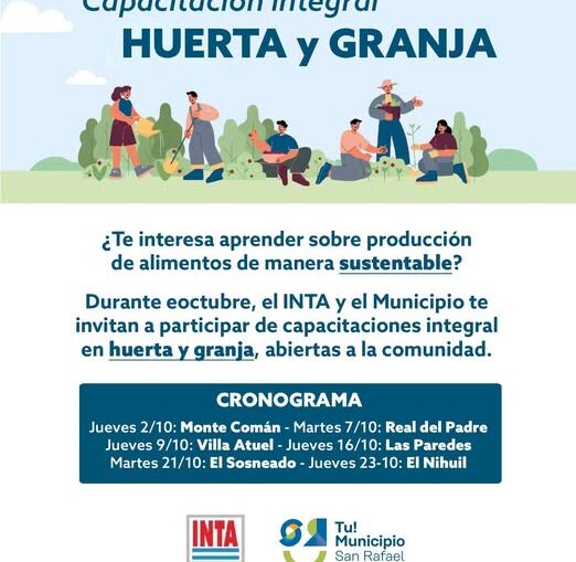 EL MUNICIPIO Y EL INTA BRINDARÁN CAPACITACIONES DE HUERTA Y GRANJA EN LOS DISTRITOS homepage Inf. General 1 octubre, 2025 Las huertas y granjas familiares fueron un importante sustento para cientos de familias de las zonas rurales durante muchos años. La pequeña quintita en el patio, plantines de estación, algunos frutales y la cría de algunos animales eran sustento y alimento. Con el objetivo de recuperar estas prácticas y valorizar la tarea de quienes aún las sostienen, el INTA Rama Caída y el Municipio de San Rafael brindarán una serie de capacitaciones abiertas a la comunidad. “Queremos que los vecinos puedan redescubrir el valor de producir alimentos sanos y sostenibles”, explicó la Directora de Distritos, Vanina Cabrera. La propuesta comenzará este jueves 2 de octubre a las 10 de la mañana en el CIC de Monte Comán y consta de un taller de “capacitación