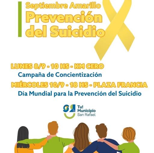 SEPTIEMBRE AMARILLO EN EL KILÓMETRO CERO homepage Inf. General 8 septiembre, 2025 San Rafael se suma a la campaña mundial “Septiembre Amarillo” para la concientización y prevención del suicidio. Hoy a las 10 habrá actividades en el Kilómetro Cero y el miércoles a las 18.30 en Plaza Francia.