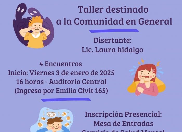 TALLER PARA EL MANEJO DE CRISIS DE ANSIEDAD Y ATAQUES DE PÁNICO EN EL HTAL. SCHESTAKOW homepage Inf. General 27 diciembre, 2024 A raíz de observar en el último tiempo que la mayor cantidad de consultas a la guardia y a los servicios de salud mental tienen que ver con crisis de ansiedad y ataques de pánico, el Hospital Schestakow, desde su Servicio de Salud Mental, ha decidido hacer un taller justamente dedicado a estos pacientes”, explicó en principio Laura Bielli, jefa de Salud Mental. “Venga y aprenda a manejar sus crisis de ansiedad y de pánico es el nombre que se le ha dado a este taller dirigido por una psicóloga, Laura Hidalgo, quien se desempeña en el Servicio de Salud Mental, y está destinado a la comunidad en general”, explicó la doctora Bielli. La capacitación se desarrollará en 4 encuentros consecutivos, los