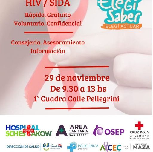 HOY TESTEOS GRATUITOS POR EL DÍA DEL HIV homepage Inf. General 29 noviembre, 2024 Esta mañana, de 9 a 13 hs, por el Día Mundial de Respuesta al VIH/Sida, las entidades de salud de San Rafael se reúnen en la 1era cuadra del Paseo Pellegrini para realizar testeos gratuitos, confidenciales y rápidos. También habrá consejería, asesoramiento e información.